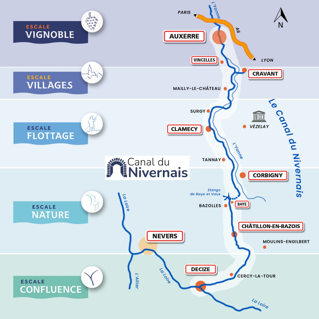 Cette escale commence à Decize, porte sud du canal du Nivernais et point de convergence de canaux et de rivières avec la Loire. La présence d'une borne kilomètre 0 à Saint-Léger-des-Vignes, indique son début.