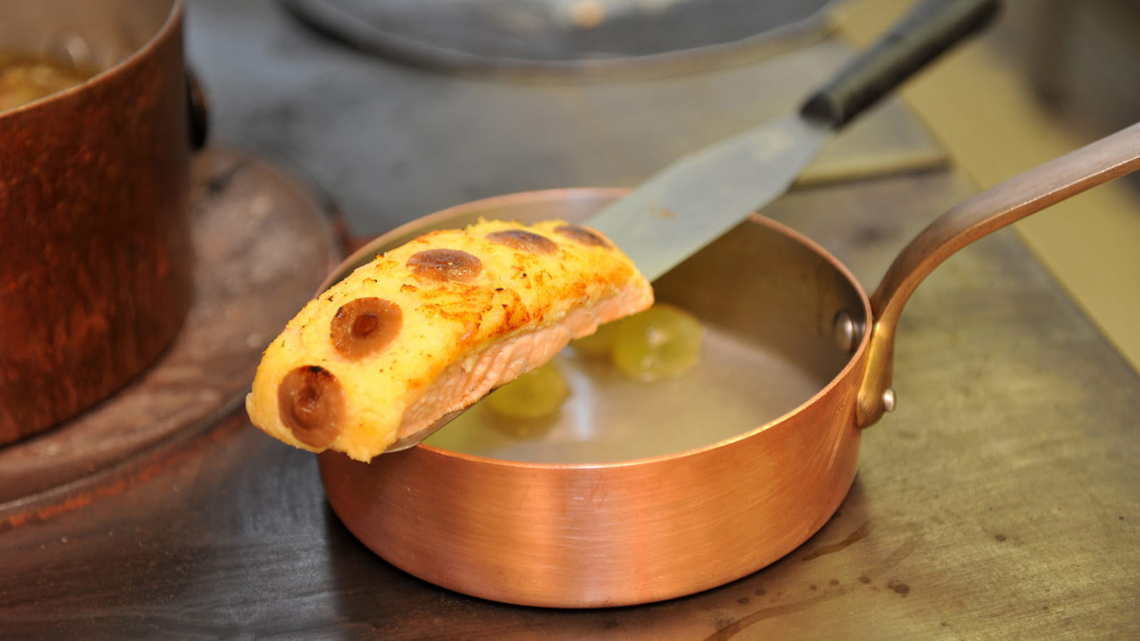 ● Dans une petite casserole, mettre les arêtes cassées de saumon, mouiller au Pouilly et cuire doucement jusqu’à réduire à 1/3 puis ajouter la crème. Incorporer doucement 50 g de beurre et réserver au bain-marie (60°).